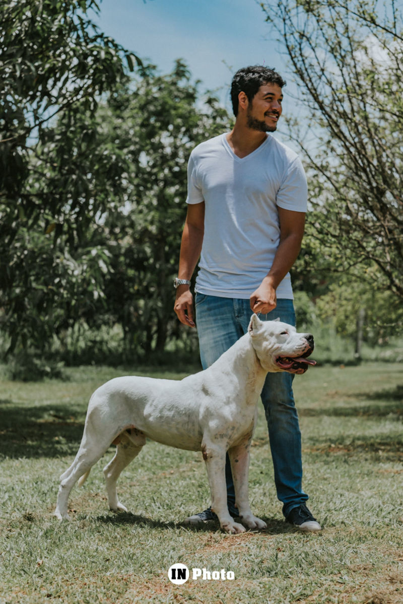 O local escolhido pro ensaio de casal foi o jardim do canil do onde o noivo cria a raça de cães Dogo Argentino.